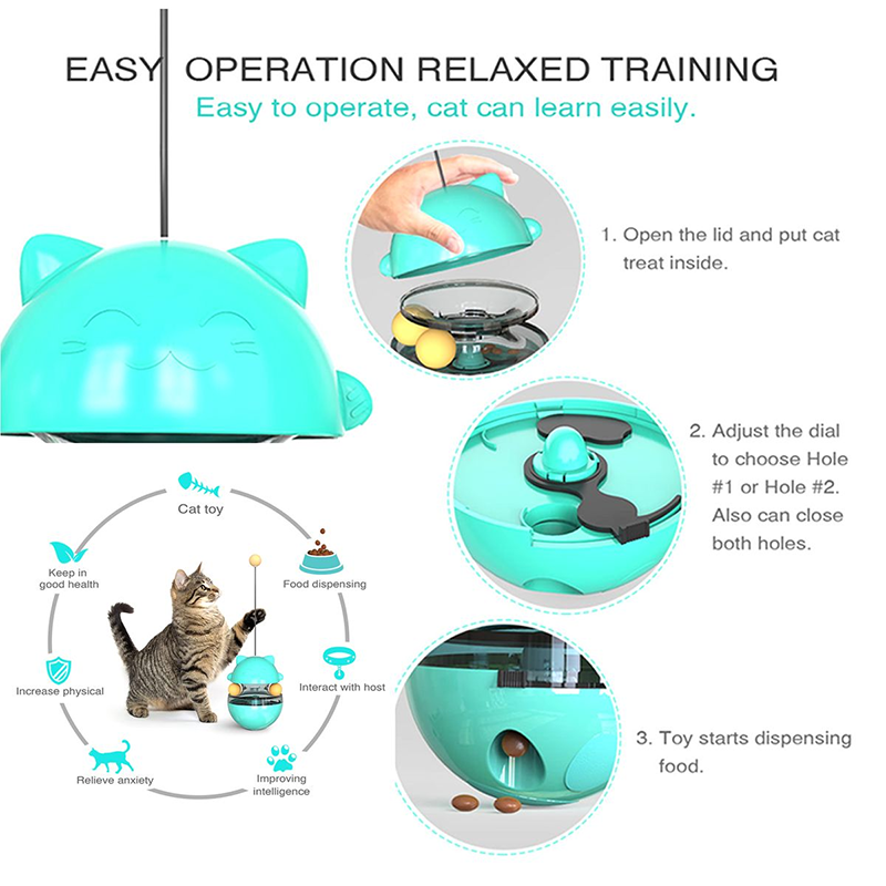 This pet toy is made of ABS+PP material and has multi-functional interaction: carousel toys, cat sticks, tumbler toys and cats can satisfy all the fun. Safe material: Our products are made of non-toxic and environmentally friendly ABS material, which is safe for the owner and the kitten. Interesting design: It can be played indoors or outdoors, pets can eat food or play with us while playing, reducing the boring time of pets and eliminating boredom.