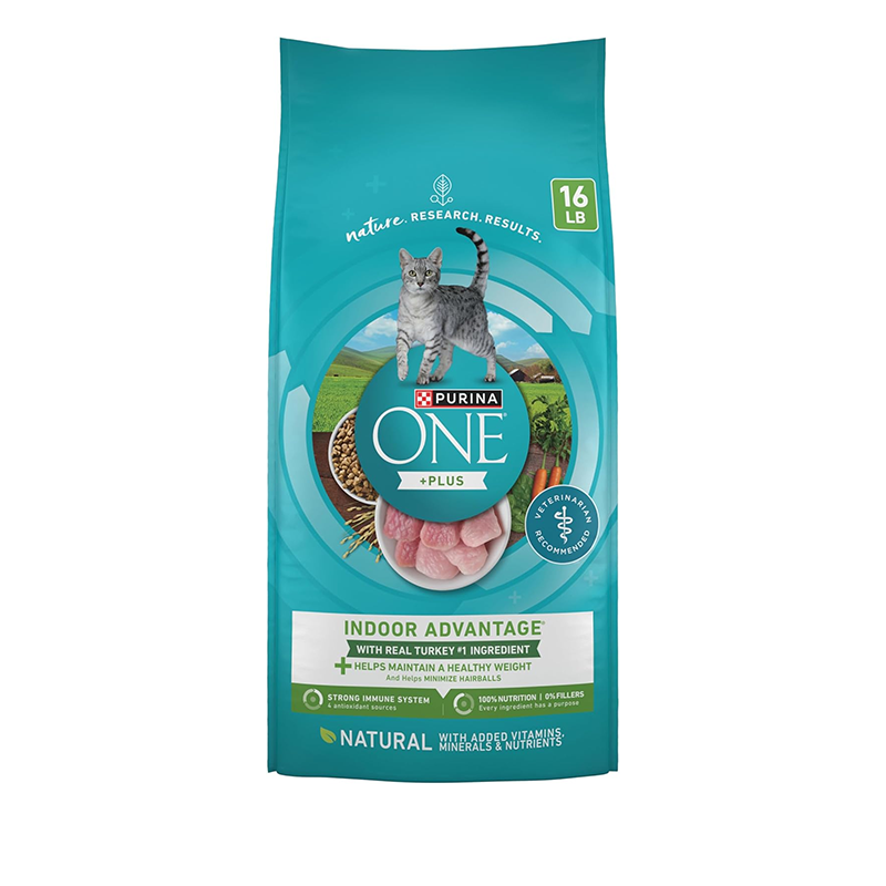 Put your indoor cat’s nutritional needs front and center with Purina ONE +Plus Indoor Advantage adult dry cat food. Tailored to meet the special nutritional requirements of indoor cats, this weight management adult dry cat food starts with real turkey as the number 1 ingredient. Each cup of Purina ONE Indoor Advantage adult dry cat food contains 37 grams of protein to help support her strong muscles, including her healthy heart. We formulate this dry cat food for weight control to help your feline friend maintain a healthy weight and add a natural fiber blend to help minimize hairballs. Purina indoor dry cat food contains no artificial flavors or preservatives and 0 percent fillers, so every high-quality ingredient has a purpose. Plus, our hairball control cat food recipe provides your adult cat with 100 percent complete and balanced nutrition to help her thrive. Omega-6 fatty acids support her radiant coat and healthy skin, and the crunchy kibble cat food with calcium supports healthy teeth and gums.