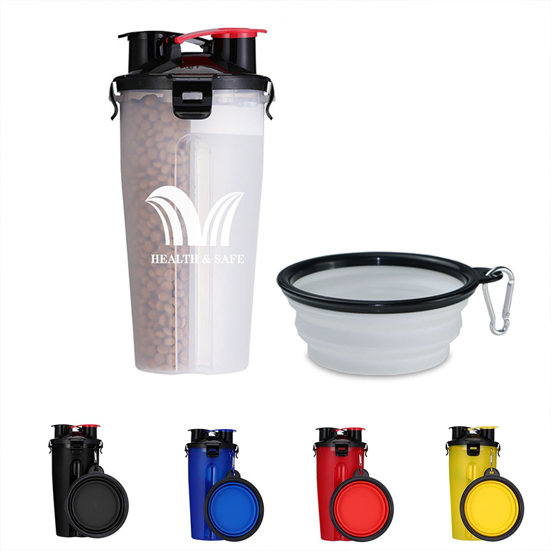 The dog bottle is made of polypropylene and the bowl is made of thermoplastic elastomer materials, easy dismantling and cleaning. Dual-Use Design: Designed with two chambers in one bottle, one for dry food and the other for water. With two wide-mouth snap lids on the top of the cap, easy for dispensing snack or pouring water. Leak-Proof Lid: Locking lids embedded with silicone gaskets which seal the bottles tightly and protect the food from air and water while keeping it fresh. The leak-proof lids prevent liquid from leaking.